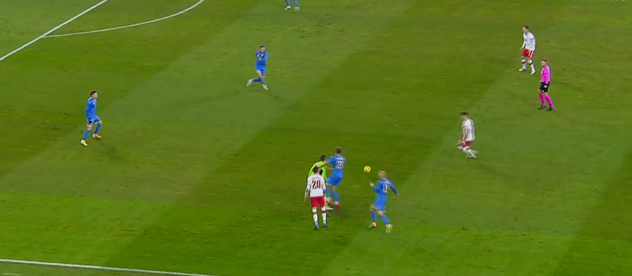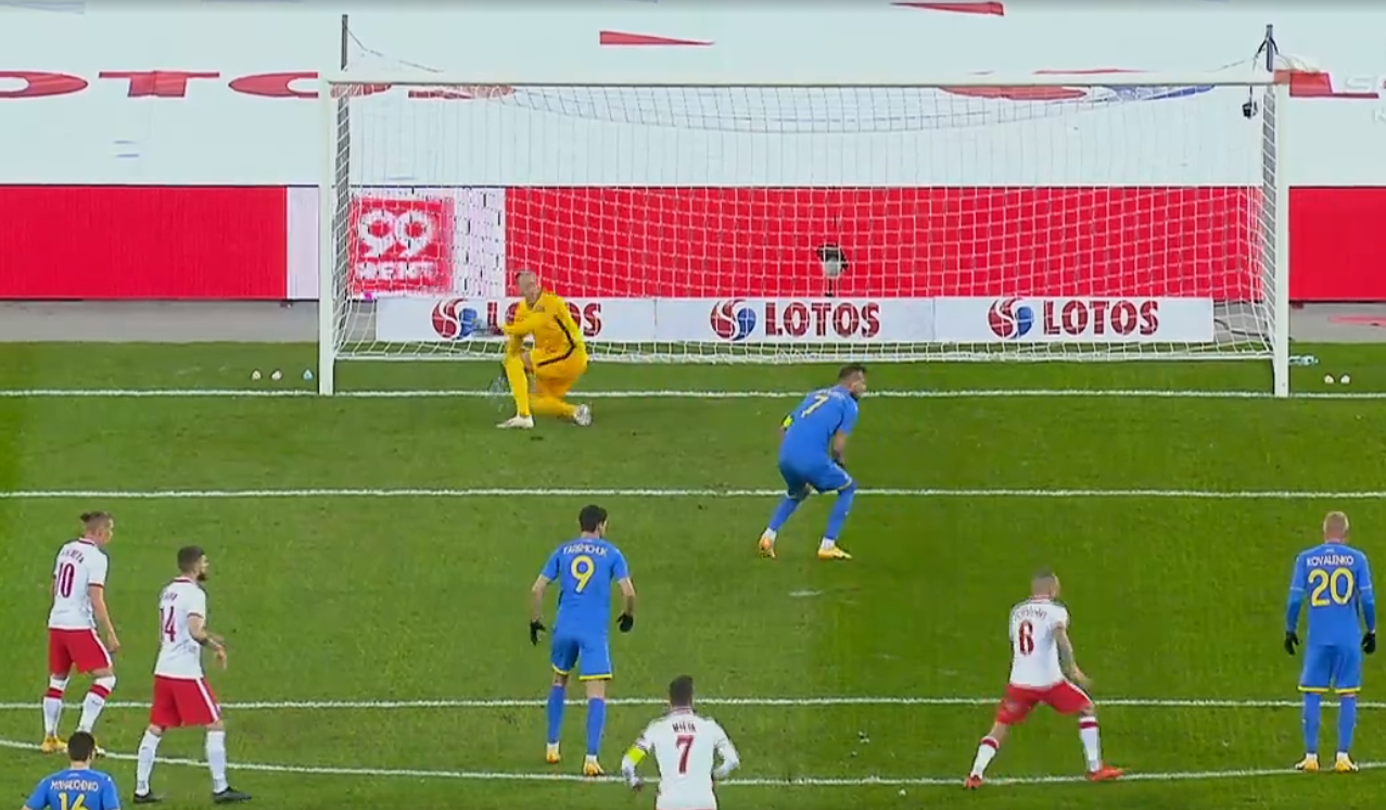 W 12. minucie błąd popełnił Paweł Bochniewicz. Stoper reprezentacji Polski był spóźniony, ale wydaje się, że zupełnie niepotrzebnie wykonał wślizg w polu karnym i powalił Andrija Jarmołenkę, który wyrzucał się zagraniem z tzw. "światła" bramki. Do jedenastki podszedł sam poszkodowany i co prawda Łukasz Skorupski wylądował w jednym rogu, a piłka powędrowała w drugą stronę, ale zatrzymała się na słupku.