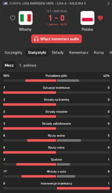 Niby statystyki bywają złudne, ale w tym przypadku te po I połowie powiedziały o niej wszystko. Włosi totalnie zdominowali Polaków i Biało-Czerwoni mogli być tylko zadowoleni z tego, że po stronie strat widniała tylko jedna bramka...