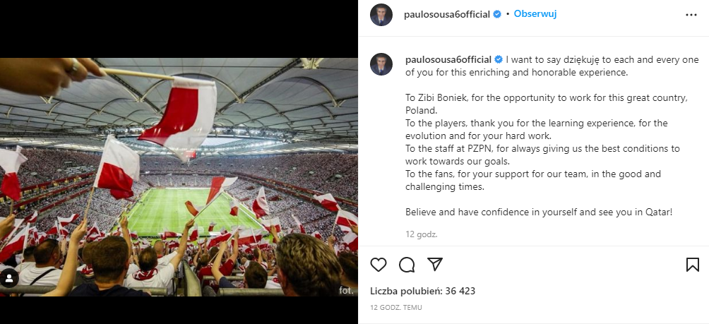 - Chcę podziękować wszystkim za wzbogacające i zaszczytne doświadczenie. Dziękuje Zbigniewowi Bońkowi za możliwość pracy dla wspaniałego kraju. Dla Polski. Piłkarzom dziękuje za naukę, ewolucję i trudną pracę. Pracownikom PZPN dziękuje ze świetne warunki do pracy, a kibicom za wsparcie w dobrych i tych ciężkich czasach - napisał Sousa.