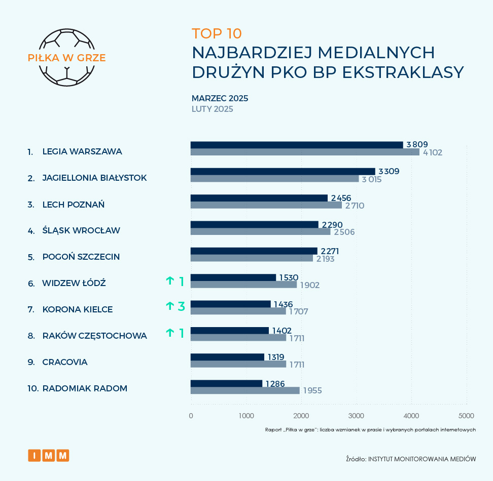 Drugie miejsce medialnego zestawienia IMM zajmuje następna rewelacja europejskiego pucharu – Jagiellonia Białystok. Drużyna z Podlasia rozprawiła się z belgijskim Cercle Brugge i o półfinał walczyła z hiszpańskim z hiszpańskim Realem Betis. Piłkarze Adriana Siemieńca zaliczyli również udany miesiąc na boiskach PKO BP Ekstraklasy, a w meczu na szczycie ligi pokonali Lecha Poznań 2:1. I to właśnie Lech Poznań zamyka podium zarówno rankingu IMM, jak i PKO BP Ekstraklasy. Oznacza to spadek o dwa miejsca w tabeli, ponieważ piłkarze „Kolejorza” rozpoczęli miesiąc jako lider krajowych rozgrywek. Porażki w dwóch ostatnich pojedynkach (z Jagiellonią i Śląskiem Wrocław) sprawiły, iż aktualnie drużyna z Poznania traci już 5 pięć punktów do Rakowa Częstochowa, ale nadal jest poważnym kandydatem do mistrzostwa. Śląsk Wrocław, wygrywając z poznańskim, Lechem dał wyraźny sygnał do walki o utrzymanie się w najwyższej lidze Polski, a to z kolei zaowocowało wysoką pozycją w rankingu medialności. Czołową piątkę zamknęła Pogoń Szczecin, która prezentuje stabilną formę sportową i znajduje się tuż za podium ligi.
