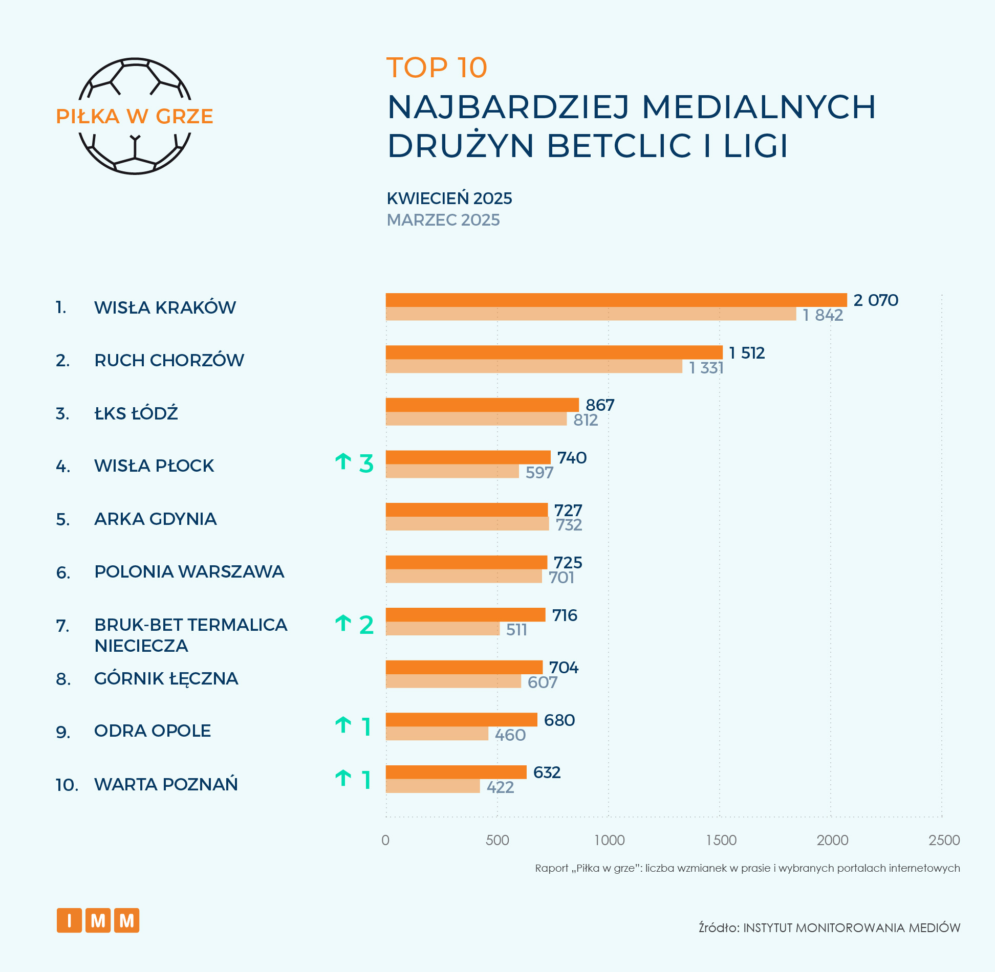 Drużyna z Krakowa rozpoczęła ubiegły miesiąc od porażki w finale Superpucharu Polski, ale po serii zwycięstw ligowych dołączyła do walki o podium Betclic 1. Ligi. Zajmujący drugie miejsce w zestawieniu IMM Ruch Chorzów znacznie oddalił się od miejsc barażowych i aktualnie zajmuje miejsce w środku tabeli, co wywołało wiele dyskusji w mediach na temat zmiany sztabu szkoleniowego. Podium rankingu „Piłka w grze” zamyka ŁKS Łódź, który również znajduje się w połowie ligowej tabeli, a przed rozpoczęciem sezonu predykcje zakładały awans do PKO BP Ekstraklasy. Aktualna sytuacja łódzkiego klubu wzbudza wiele emocji wśród kibiców, którzy w większości spisali ten sezon na straty i apelują o zmiany personalne, aby w nową odsłonę rozgrywek wejść z odświeżoną kadrą i ponownie walczyć o awans.