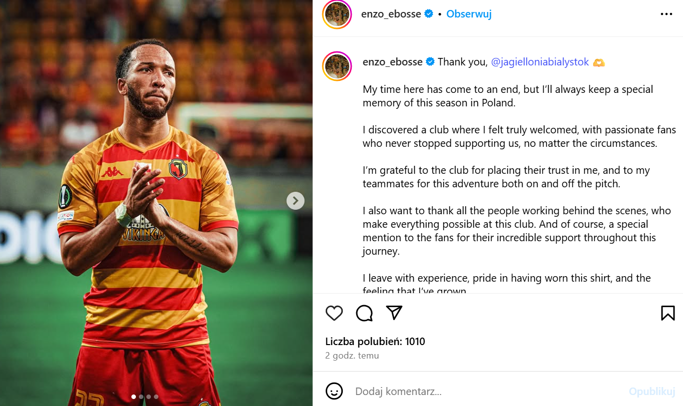 Ebosse już oficjalnie przekazał, że odchodzi o wraca do Udinese Calcio. Tajemniczy wpis zamieścił natomiast Churlinov, który po prostu podziękował za sezon. Już od jakiegoś czasu mówi się o tym, że zatrzymać 24-latka będzie bardzo trudno i że Dumy Podlasia raczej nie stać na wykupienie go z Burnley.
