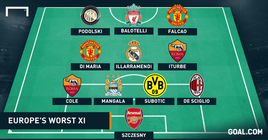 Szczęsny ma w zestawieniu goal.com znakomitych partnerów, którzy także minionego sezonu nie zaliczą do udanych. Oprócz Polaka z Premier League są jeszcze Eliaquim Mangala (Manchester City), który kosztował krocie, a rozczarował, Angel Di Maria (Manchester United), który nie umiał zaaklimatyzować się na Old Trafford, nieskuteczny Radamel Falcao (Manchester United) i jeszcze słabszy niż Kolumbijczyk Mario Balotelli (Liverpool FC).